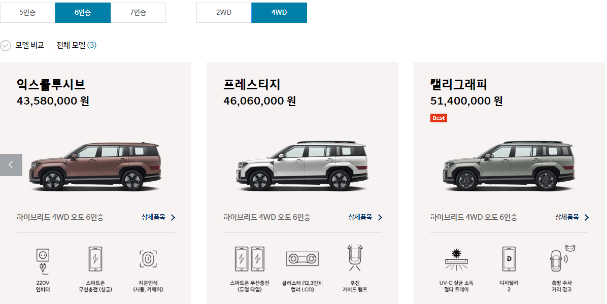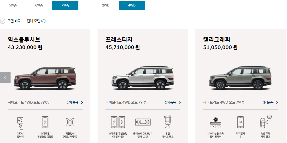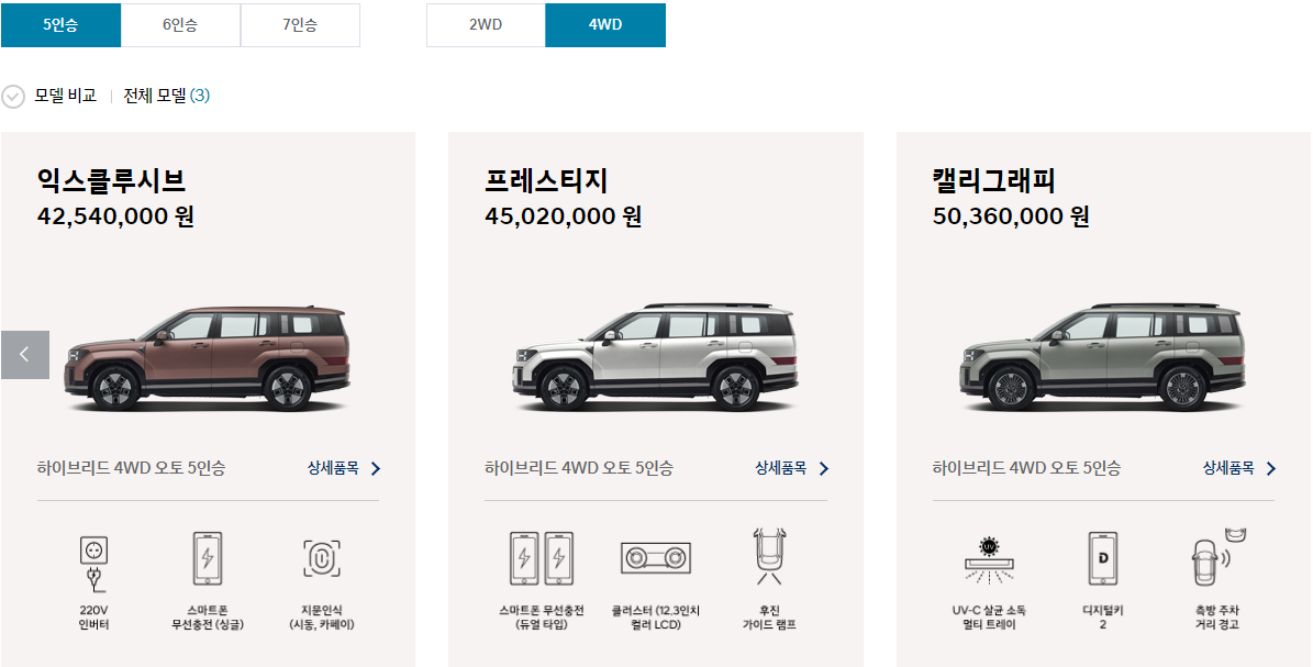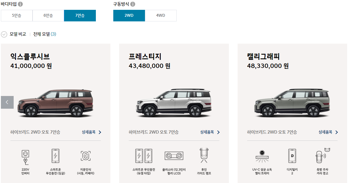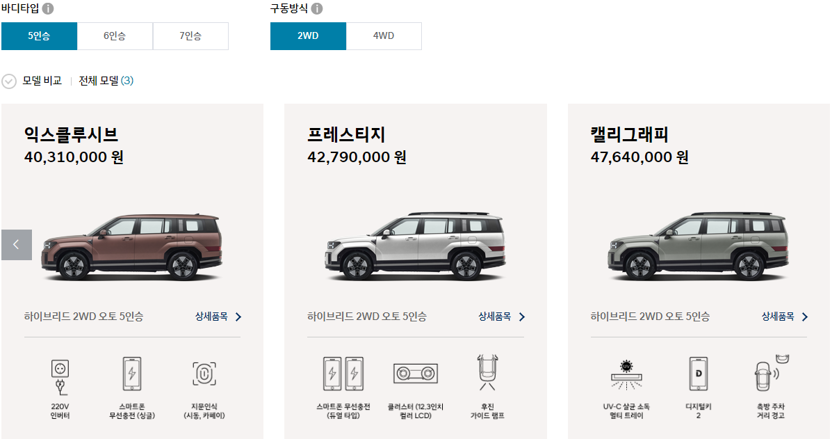 5인승 / 6인승 / 7인승 + 2륜구동 / 4륜구동 으로 선택 가능