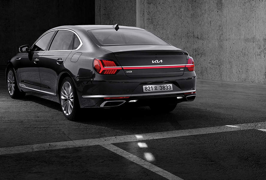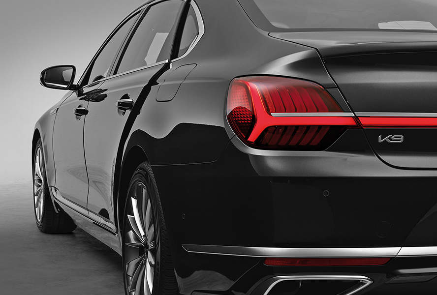 K9의 외관 디자인은 웅장하고 고급스러운 럭셔리 세단의 모습을 보여줍니다. 전면부는 풍부한 볼륨감과 입체감으로 완성되어 있으며, Duplex LED DRL과 시퀀셜 무빙 턴 시그널은 미래지향적인 고급스러움을 연출합니다. 아일랜드 후드 적용으로 차량의 웅장하고 럭셔리한 느낌을 더욱 강조하며, 강인한 캐릭터 라인과 독립된 후드 파팅은 우아한 선을 조화롭게 연출합니다.