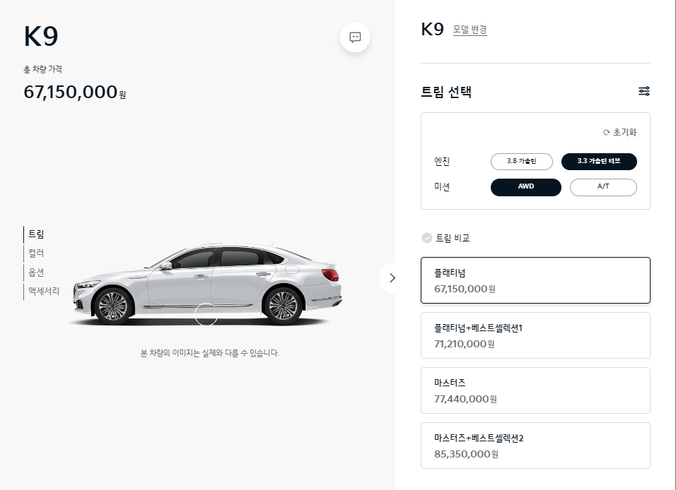 K9은 다양한 엔진 옵션을 제공합니다. 예를 들어, 람다 3.8 V6 GDI 엔진은 최고출력 315PS, 최대토크 40.5kg.m을 제공하며, 람다 3.3 V6 T-GDI 트윈 터보차저는 최고출력 370PS, 최대토크 52kg.m의 역동적이고 풍부한 가속성능을 제공합니다. 이러한 강력한 엔진은 K9에게 뛰어난 주행 성능과 가속력을 부여합니다.