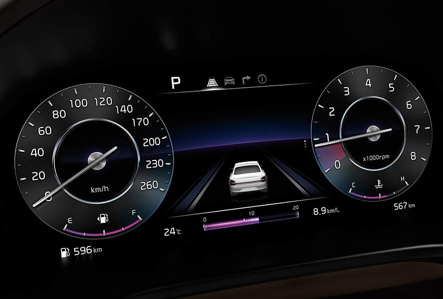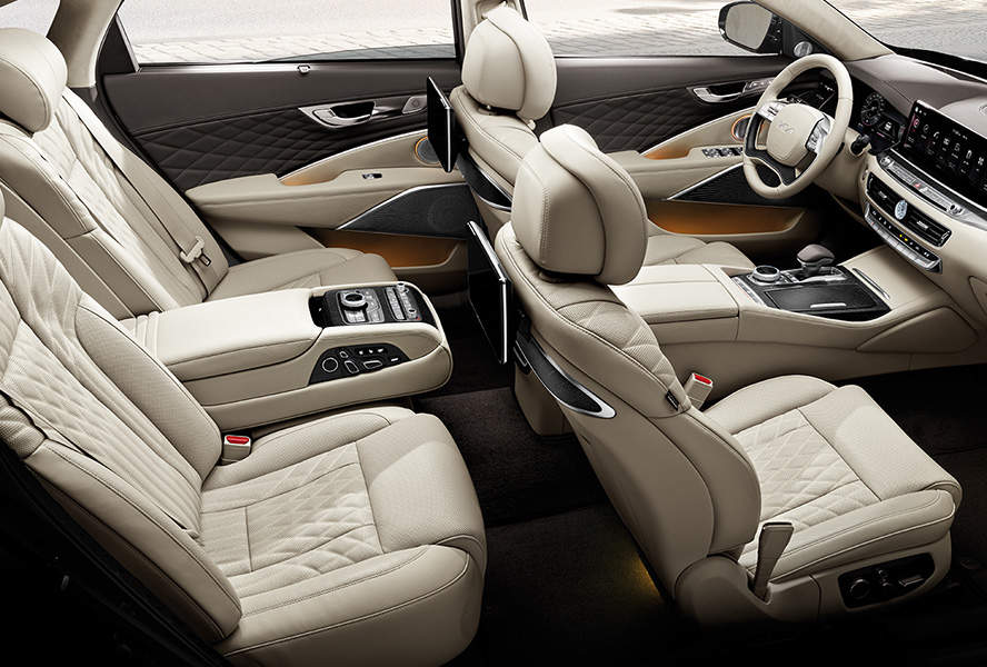 K9의 내부는 고급스러움과 편안함이 강조된 디자인으로, 최신 기술과 편의 사양이 잘 조화를 이룹니다. 넓은 실내 공간과 고급 재질의 사용은 K9이 제공하는 럭셔리한 경험을 더욱 강조합니다. 최신 인포테인먼트 시스템과 다양한 연결성 옵션은 현대적인 운전자의 요구를 충족시킵니다.